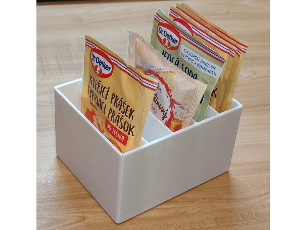 Praktický organizér na menší i větší kuchyňské sáčky, který udrží kypřicí prášky, vanilkové cukry i koření přehledně srovnané na lince nebo v šuplíku.
